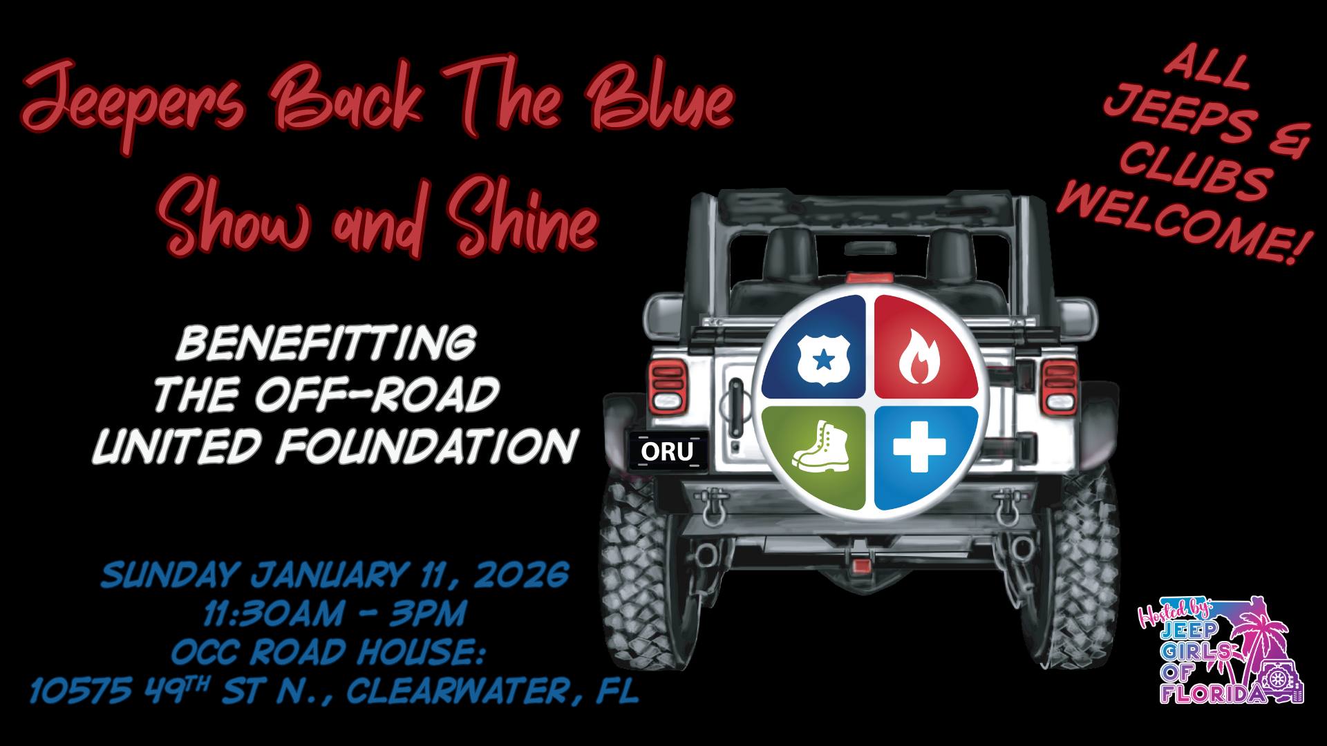 Join us on January 11, 2026, from 11:30 AM to 3 PM at the OCC Road House in Clearwater, for the Jeepers Back the Blue Show and Shine event! For a $10 entry fee per Jeep (to enter the main event lot), you can showcase your vehicle, connect with fellow Jeep enthusiasts, and support the Off-Road United Foundation, which aids first responders and the families of fallen officers. All funds raised will go directly to this amazing cause.
