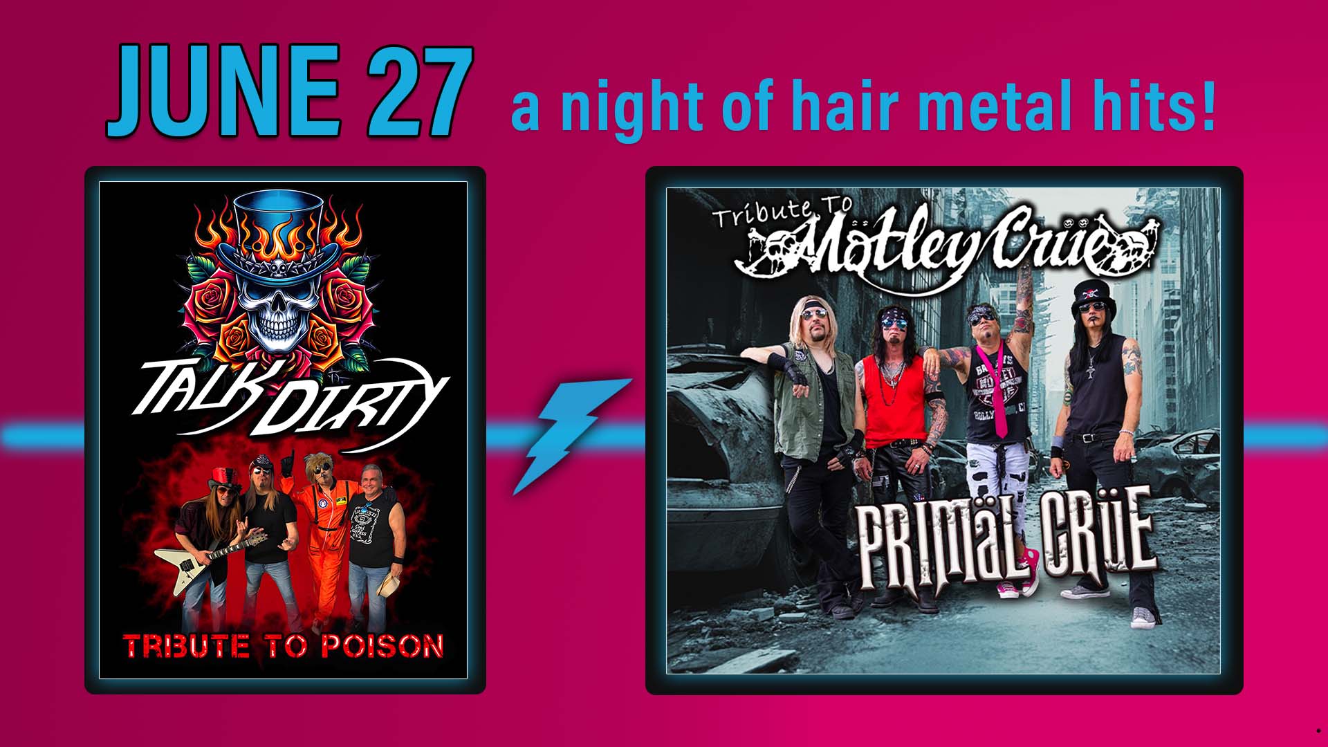 Saturday, June 27- Join us for Primal Crue- Tribute to Motley Crue w/ Special Guest Talk Dirty- Tribute to Poison!